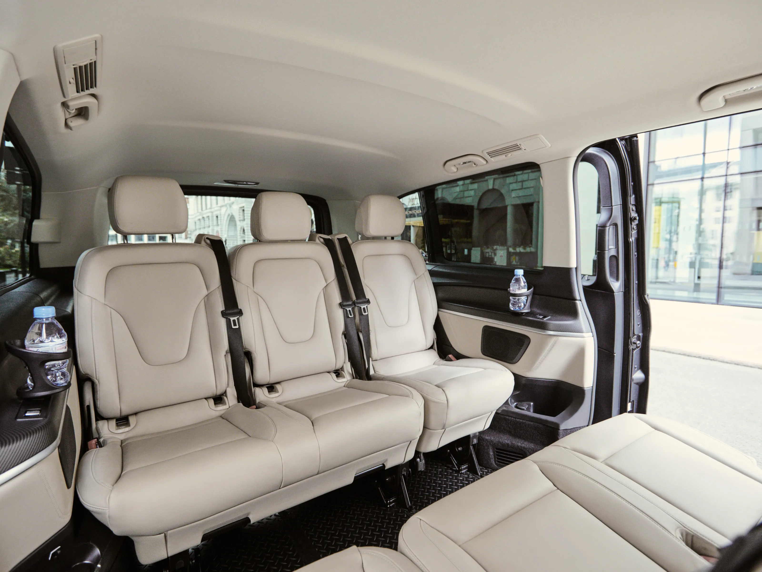 Véhicules Mercedes récents, sièges en cuir, Wi-Fi gratuit, bouteilles d'eau offertes.